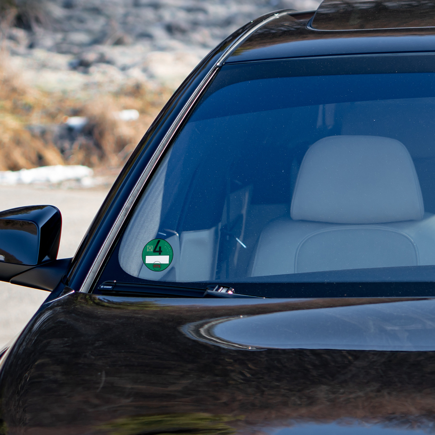 Miljømærkatet er selvklæbende og klæbes permanent fast indvendigt på forruden i bilens højre side/passagersiden.